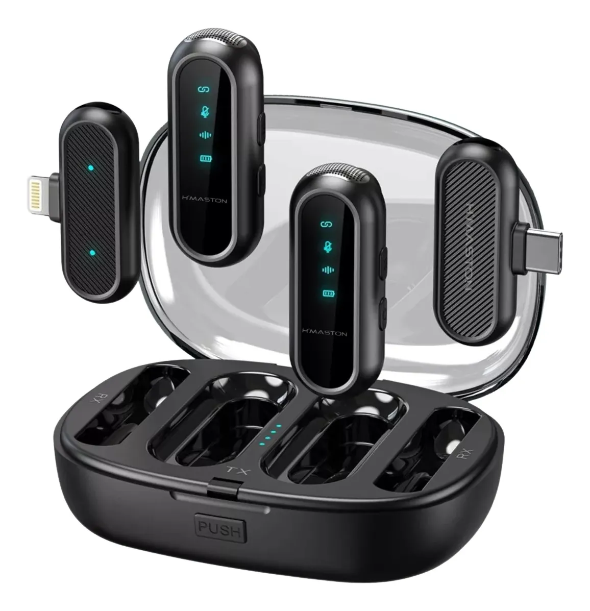 – Bateria de Longa Duração: Até 9 horas de uso contínuo e estojo de carregamento portátil 1200mAh, que recarrega os microfones até 9 vezes.