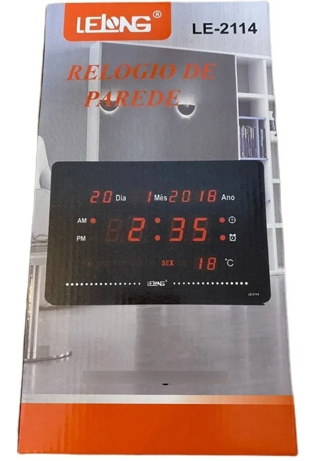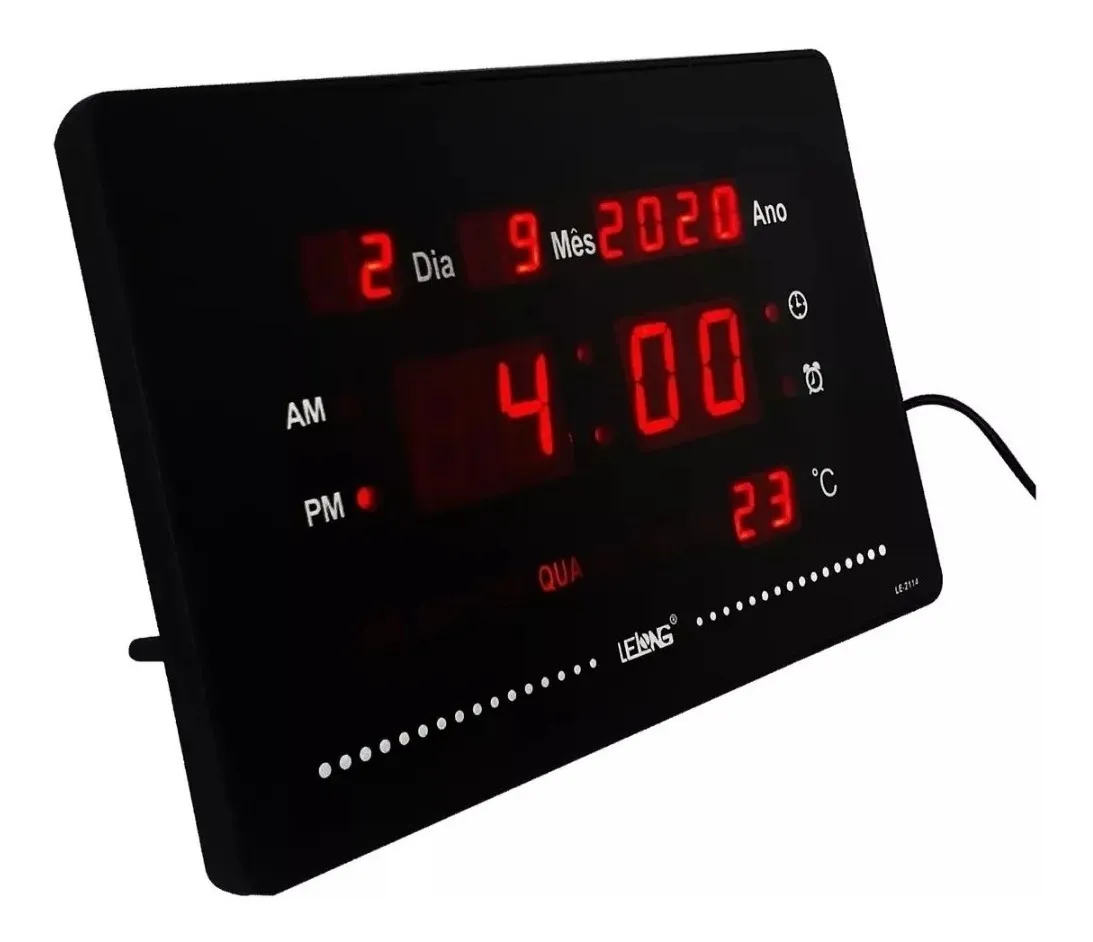 Relógio digital, termômetro e calendário com led. Tamanho grande led vermelho. Visualização à distância. Exibição, minutos, ano, mês, data, temperatura hora. Possui calendário automático, termômetro e alarme com música.
