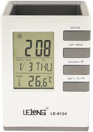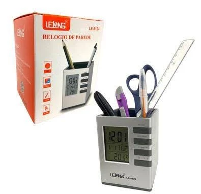 O Relógio Digital Temperatura Porta Caneta Calendário Cor Prata da marca Lelong (Modelo LE-8124) é a combinação perfeita de funcionalidade e elegância para sua mesa. Com um design prateado sofisticado, ele não apenas serve como um despertador, mas também como um prático organizador de canetas, garantindo que sua área de trabalho se mantenha arrumada e estilosa.